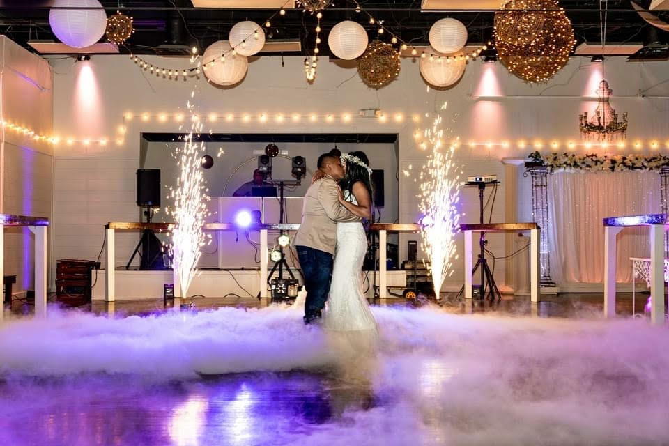 • bride and groom first dance on fog filled dance floor